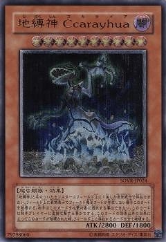 地縛神じばくしん Ccarayhuaコカライア/Earthbound Immortal Ccarayhua》 † 効果モンスター 星10/闇属性/爬虫類族/攻2800/守1800 「地縛神」と名のついたモンスターはフィールド上に1体しか表側表示で存在できない。 フィールド魔法カードが表側表示で存在しない場合このカードを破壊する。 相手はこのカードを攻撃対象に選択できない。 このカードは相手プレイヤーに直接攻撃できる。 また、このカードがこのカード以外の効果によって破壊された時、 フィールド上のカードを全て破壊する。