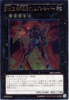 No.ナンバーズ12 機甲忍者きこうにんじゃクリムゾン・シャドー/Number 12: Crimson Shadow Armor Ninja》 † エクシーズ・効果モンスター ランク5/地属性/戦士族/攻2400/守1700 レベル5モンスター×2 1ターンに1度、このカードのエクシーズ素材を1つ取り除いて発動できる。 このターン、自分フィールド上の「忍者」と名のついた モンスターは戦闘及びカードの効果では破壊されない。 この効果は相手ターンでも発動できる。