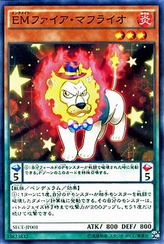 EMエンタメイトファイア・マフライオ/Performapal Fire Mufflerlion》 † ペンデュラム・効果モンスター 星3/炎属性/獣族/攻 800/守 800 【Pスケール:青5/赤5】 (1):自分フィールドのPモンスターが戦闘で破壊された時に発動できる。 Pゾーンのこのカードを特殊召喚する。 【モンスター効果】 (1):1ターンに1度、自分のPモンスターが 相手モンスターを戦闘で破壊したダメージ計算後に発動できる。 その自分のモンスターは、バトルフェイズ終了時まで攻撃力が200アップし、 もう1度だけ続けて攻撃できる。