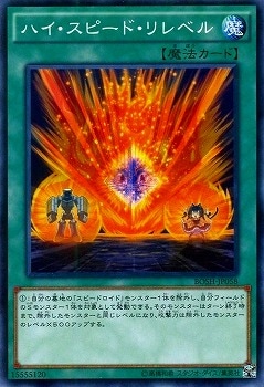 《ハイ・スピード・リレベル/Hi-Speed Re-Level》 † 通常魔法 (1):自分の墓地の「スピードロイド」モンスター1体を除外し、 自分フィールドのSモンスター1体を対象として発動できる。 そのモンスターはターン終了時まで、 除外したモンスターと同じレベルになり、 攻撃力は除外したモンスターのレベル×500アップする。