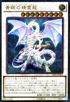 《青眼の精霊龍ブルーアイズ・スピリット・ドラゴン/Blue-Eyes Spirit Dragon》 † シンクロ・効果モンスター 星9/光属性/ドラゴン族/攻2500/守3000 チューナー+チューナー以外の「ブルーアイズ」モンスター1体以上 (1):このカードがモンスターゾーンに存在する限り、 お互いに2体以上のモンスターを同時に特殊召喚できない。 (2):1ターンに1度、墓地のカードの効果が発動した時に発動できる。 その発動を無効にする。 (3):S召喚したこのカードをリリースして発動できる。 エクストラデッキから「青眼の精霊龍」以外の ドラゴン族・光属性のSモンスター1体を守備表示で特殊召喚する。 そのモンスターはこのターンのエンドフェイズに破壊される。 この効果は相手ターンでも発動できる。