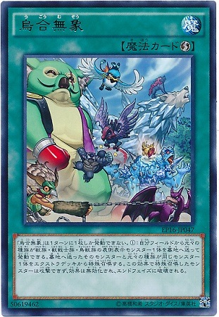 《烏合無象うごうむぞう/Cattle Call》 † 速攻魔法 「烏合無象」は1ターンに1枚しか発動できない。 (1):自分フィールドから元々の種族が 獣族・獣戦士族・鳥獣族の表側表示モンスター1体を墓地へ送って発動できる。 墓地へ送ったそのモンスターと元々の種族が同じモンスター1体をエクストラデッキから特殊召喚する。 この効果で特殊召喚したモンスターは攻撃できず、 効果は無効化され、エンドフェイズに破壊される。