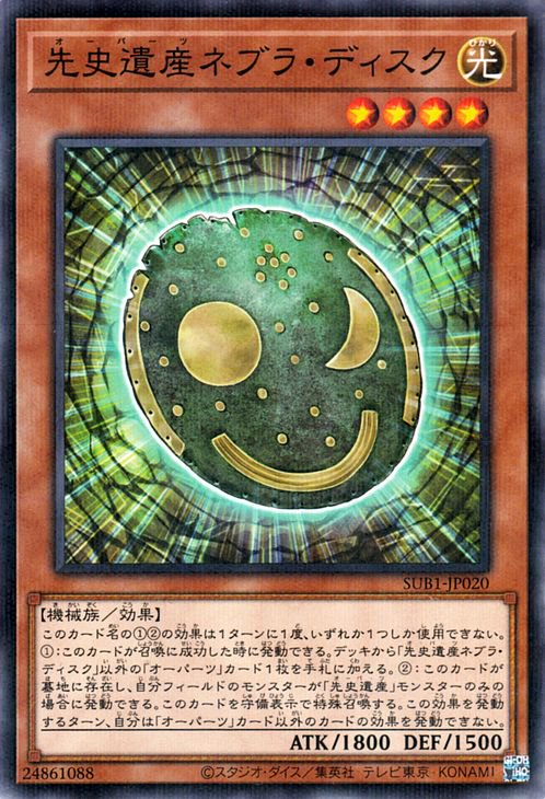 《先史遺産オーパーツネブラ・ディスク/Chronomaly Nebra Disk》 † 効果モンスター 星4/光属性/機械族/攻1800/守1500 このカード名の(1)(2)の効果は1ターンに1度、いずれか1つしか使用できない。 (1):このカードが召喚に成功した時に発動できる。 デッキから「先史遺産ネブラ・ディスク」以外の「オーパーツ」カード1枚を手札に加える。 (2):このカードが墓地に存在し、自分フィールドのモンスターが「先史遺産」モンスターのみの場合に発動できる。 このカードを守備表示で特殊召喚する。 この効果を発動するターン、自分は「オーパーツ」カード以外のカードの効果を発動できない。