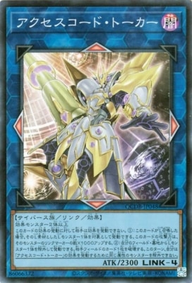 《アクセスコード・トーカー/Accesscode Talker》 † リンク・効果モンスター リンク4/闇属性/サイバース族/攻2300 【リンクマーカー:上/左/右/下】 効果モンスター2体以上 このカードの効果の発動に対して相手は効果を発動できない。 (1):このカードがL召喚した場合、そのL素材としたLモンスター1体を対象として発動できる。 このカードの攻撃力は、そのモンスターのリンクマーカーの数×1000アップする。 (2):自分のフィールド・墓地からLモンスター1体を除外して発動できる。 相手フィールドのカード3枚を破壊する。 このターン、自分は「アクセスコード・トーカー」の効果を発動するために同じ属性のモンスターを除外できない。