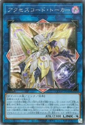 《アクセスコード・トーカー/Accesscode Talker》 † リンク・効果モンスター リンク4/闇属性/サイバース族/攻2300 【リンクマーカー:上/左/右/下】 効果モンスター2体以上 このカードの効果の発動に対して相手は効果を発動できない。 (1):このカードがL召喚した場合、そのL素材としたLモンスター1体を対象として発動できる。 このカードの攻撃力は、そのモンスターのリンクマーカーの数×1000アップする。 (2):自分のフィールド・墓地からLモンスター1体を除外して発動できる。 相手フィールドのカード2枚を破壊する。 このターン、自分は「アクセスコード・トーカー」の効果を発動するために同じ属性のモンスターを除外できない。