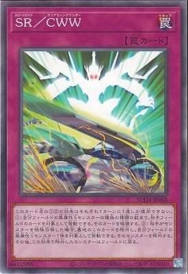 《SRスピードロイド/CWWクリアウィングワンダー》 † 通常罠 このカード名の(1)(2)の効果はそれぞれ1ターンに1度しか使用できない。 (1):自分フィールドの風属性Sモンスターの種族の種類の数まで、 相手フィールドのカードを対象として発動できる。 そのカードを破壊する。 (2):相手がモンスターを特殊召喚した場合、墓地のこのカードを除外し、 自分フィールドの風属性Sモンスター1体を対象として発動できる。 そのモンスターを除外する。 その後、この効果で除外したモンスターはフィールドに戻る。