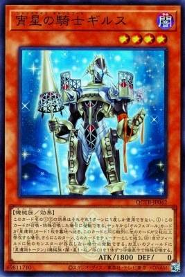 《宵星の騎士ジャックナイツ・オルフェゴールギルス/Girsu, the Orcust Mekk-Knight》 † 効果モンスター 星4/闇属性/機械族/攻1800/守 0 このカード名の(1)(2)の効果はそれぞれ1ターンに1度しか使用できない。 (1):このカードが召喚・特殊召喚した場合に発動できる。 デッキから「オルフェゴール」カードか「星遺物」カード1枚を墓地へ送る。 このカードと同じ縦列に他のカードが2枚以上存在する場合、 さらにこのターン、このカードをチューナーとして扱う。 (2):自分フィールドに他のモンスターが存在しない場合に発動できる。 お互いのフィールドに「星遺物トークン」(機械族・闇・星1・攻/守0)を1体ずつ守備表示で特殊召喚する。