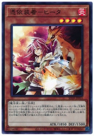 憑依装着ひょういそうちゃく−ヒータ/Familiar-Possessed - Hiita》 † 効果モンスター 星4/炎属性/魔法使い族/攻1850/守1500 (1):このカードは自分フィールドの表側表示の、 「火霊使いヒータ」1体と炎属性モンスター1体を墓地へ送り、 手札・デッキから特殊召喚できる。 (2):このカードの(1)の方法で特殊召喚したこのカードが守備表示モンスターを攻撃した場合、 その守備力を攻撃力が超えた分だけ戦闘ダメージを与える。