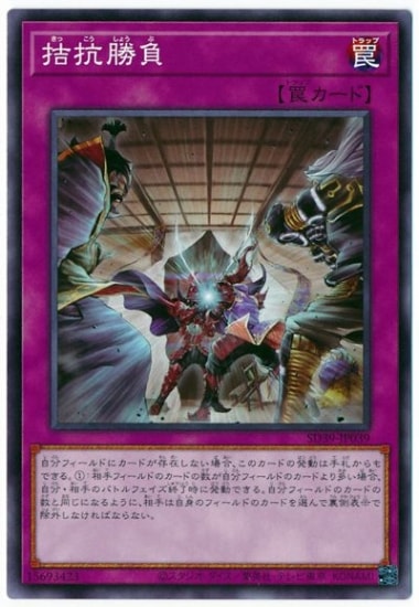 《拮抗勝負きっこうしょうぶ/Evenly Matched》 † 通常罠 自分フィールドにカードが存在しない場合、 このカードの発動は手札からもできる。 (1):相手フィールドのカードの数が自分フィールドのカードより多い場合、 自分・相手のバトルフェイズ終了時に発動できる。 自分フィールドのカードの数と同じになるように、 相手は自身のフィールドのカードを選んで裏側表示で除外しなければならない。
