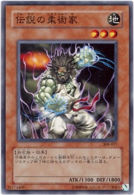 《伝説でんせつの柔術家じゅうじゅつか/Legendary Jujitsu Master》 † 効果モンスター 星3/地属性/岩石族/攻1300/守1800 フィールド上に守備表示で存在するこのカードと戦闘を行ったモンスターは、 ダメージステップ終了時に持ち主のデッキの一番上に戻る。