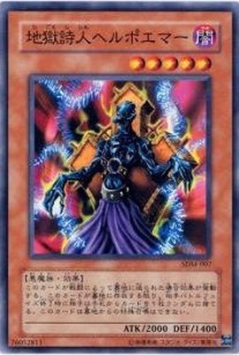 《地獄詩人じごくしじんヘルポエマー/HelpoEmer》 † 効果モンスター 星5/闇属性/悪魔族/攻2000/守1400 このカードは墓地からの特殊召喚はできない。 (1):戦闘で破壊されたこのカードが墓地に存在する場合、 相手バトルフェイズ終了時に発動する。 このカードが墓地に存在する場合、相手の手札をランダムに1枚選んで捨てる。