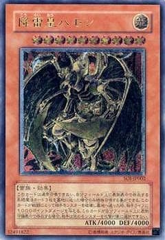 《降雷皇こうらいおうハモン/Hamon, Lord of Striking Thunder》 † 特殊召喚・効果モンスター 星10/光属性/雷族/攻4000/守4000 このカードは通常召喚できない。 自分フィールドの表側表示の永続魔法カード3枚を墓地へ送った場合のみ特殊召喚できる。 (1):このカードがモンスターゾーンに守備表示で存在する限り、 相手は他のモンスターを攻撃対象に選択できない。 (2):このカードが戦闘で相手モンスターを破壊し墓地へ送った場合に発動する。 相手に1000ダメージを与える。