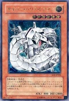 サイバー・バリア・ドラゴン/Cyber Barrier Dragon》 † 効果モンスター 星6/光属性/機械族/攻 800/守2800 このカードは通常召喚できない。 このカードは「アタック・リフレクター・ユニット」の 効果でのみ特殊召喚する事ができる。 このカードが攻撃表示の場合、 1ターンに1度だけ相手モンスター1体の攻撃を無効にする。