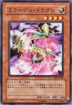 《ミラージュ・ドラゴン/Mirage Dragon》 † 効果モンスター 星4/光属性/ドラゴン族/攻1600/守 600 (1):このカードがモンスターゾーンに存在する限り、 相手はバトルフェイズに罠カードを発動できない。