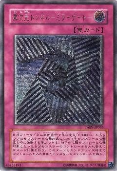 《異次元いじげんトンネル−ミラーゲート−/Mirror Gate》 † 通常罠 自分フィールド上に表側表示で存在する「E・HERO」と名のついたモンスターを 攻撃対象にした相手モンスターの攻撃宣言時に発動する事ができる。 相手の攻撃モンスターと攻撃対象となった自分モンスターの コントロールを入れ替えてダメージ計算を行う。 このターンのエンドフェイズ時まで コントロールを入れ替えたモンスターのコントロールを得る。