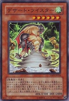 《デザート・ツイスター/Desert Twister》 † 効果モンスター 星6/風属性/悪魔族/攻2300/守2000 このカードは通常召喚できない。 自分の墓地の風属性モンスター2体と地属性モンスター1体を ゲームから除外する事でのみ特殊召喚する事ができる。 手札を1枚捨てる事でフィールド上の魔法・罠カード1枚を破壊する。 この効果は1ターンに1度しか使用できない。