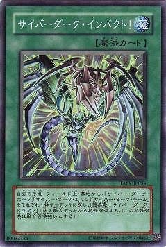 サイバーダーク・インパクト!/Cyberdark Impact!》 † 通常魔法 (1):自分の手札・フィールド・墓地から、 「サイバー・ダーク・ホーン」「サイバー・ダーク・エッジ」 「サイバー・ダーク・キール」を1枚ずつ持ち主のデッキに戻し、 「鎧黒竜−サイバー・ダーク・ドラゴン」1体をEXデッキから召喚する。