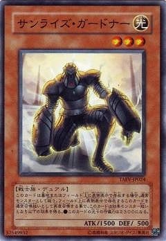 《サンライズ・ガードナー/Dawnbreak Gardna》 † デュアルモンスター 星3/光属性/戦士族/攻1500/守 500 このカードは墓地またはフィールド上に表側表示で存在する場合、 通常モンスターとして扱う。 フィールド上に表側表示で存在するこのカードを通常召喚扱いとして再度召喚する事で、 このカードは効果モンスター扱いとなり以下の効果を得る。 ●このカードの元々の守備力は2300になる。