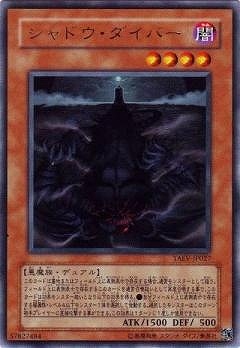 《シャドウ・ダイバー/Shadow DeLVer》 † デュアルモンスター 星4/闇属性/悪魔族/攻1500/守 500 このカードは墓地またはフィールド上に表側表示で存在する場合、 通常モンスターとして扱う。 フィールド上に表側表示で存在するこのカードを通常召喚扱いとして再度召喚する事で、  このカードは効果モンスター扱いとなり以下の効果を得る。 ●自分フィールド上に表側表示で存在する 闇属性・レベル4以下モンスター1体を選択して発動する。 選択したモンスターはこのターン相手プレイヤーに直接攻撃する事ができる。 この効果は1ターンに1度しか使用できない。