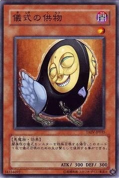 《儀式ぎしきの供物くもつ/Ritual Raven》 † 効果モンスター 星1/闇属性/悪魔族/攻 300/守 300 闇属性の儀式モンスターを特殊召喚する場合、 このカード1枚で儀式召喚のための生け贄として使用する事ができる。