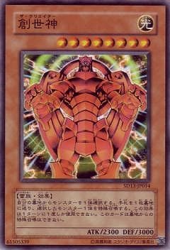《創世神ザ・クリエイター/The Creator》 † 効果モンスター 星8/光属性/雷族/攻2300/守3000 自分の墓地からモンスターを1体選択する。 手札を1枚墓地に送り、選択したモンスター1体を特殊召喚する。 この効果は1ターンに1度しか使用できない。 このカードは墓地からの特殊召喚はできない。