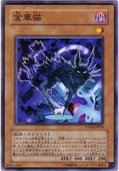 《金華猫きんかびょう/Kinka-byo》 † スピリット・効果モンスター 星1/闇属性/獣族/攻 400/守 200 このカードは特殊召喚できない。 (1):このカードが召喚・リバースした時、 自分の墓地のレベル1モンスター1体を対象として発動できる。 そのモンスターを特殊召喚する。 このカードがフィールドから離れた時にそのモンスターは除外される。 (2):このカードが召喚・リバースしたターンのエンドフェイズに発動する。 このカードを持ち主の手札に戻す。