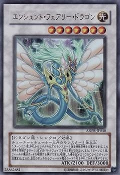 《エンシェント・フェアリー・ドラゴン/Ancient Fairy Dragon》(禁止カード) † シンクロ・効果モンスター 星7/光属性/ドラゴン族/攻2100/守3000 チューナー+チューナー以外のモンスター1体以上 1ターンに1度、手札からレベル4以下のモンスター1体を特殊召喚できる。 この効果を発動するターン、自分はバトルフェイズを行えない。 また、1ターンに1度、自分のメインフェイズ時に発動できる。 フィールド上のフィールド魔法カードを全て破壊し、 自分は1000ライフポイント回復する。 その後、デッキからフィールド魔法カード1枚を手札に加える事ができる。