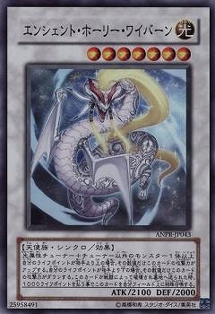 《エンシェント・ホーリー・ワイバーン/Ancient Sacred Wyvern》 † シンクロ・効果モンスター 星7/光属性/天使族/攻2100/守2000 光属性チューナー+チューナー以外のモンスター1体以上 自分のライフポイントが相手より多い場合、 このカードの攻撃力はその差の数値分アップする。 自分のライフポイントが相手より少ない場合、 このカードの攻撃力はその差の数値分ダウンする。 また、このカードが戦闘によって破壊され墓地へ送られた時、 1000ライフポイントを払う事でこのカードを墓地から特殊召喚する。