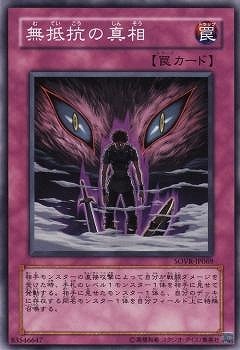 《無抵抗むていこうの真相しんそう/Wolf in Sheep's Clothing》 † 通常罠 相手モンスターの直接攻撃によって自分が戦闘ダメージを受けた時、 手札のレベル1モンスター1体を相手に見せて発動する。 相手に見せたモンスター1体と、自分のデッキに存在する同名モンスター1体を 自分フィールド上に特殊召喚する。