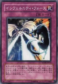インフェルニティ・フォース/Infernity Force》 † 通常罠 自分の手札が0枚の場合、 「インフェルニティ」と名のついたモンスターが 攻撃対象に選択された時に発動する事ができる。 攻撃モンスター1体を破壊し、 自分の墓地に存在する「インフェルニティ」と 名のついたモンスター1体を選択して特殊召喚する。