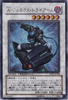 《Aアーリー・ジェネクス・トライアーム/Genex Ally Triarm》 † シンクロ・効果モンスター 星6/闇属性/機械族/攻2400/守1600 「ジェネクス・コントローラー」+チューナー以外のモンスター1体以上 このカードのシンクロ素材としたチューナー以外のモンスターの属性によって、 以下の効果を1ターンに1度、手札を1枚捨てて発動できる。 ●風属性:相手の手札をランダムに1枚墓地へ送る。 ●水属性:フィールド上の魔法・罠カード1枚を選択して破壊する。 ●闇属性:フィールド上の光属性モンスター1体を選択して破壊し、 デッキからカードを1枚ドローする。