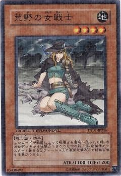 《荒野こうやの女戦士おんなせんし/Warrior Lady of the Wasteland》 † 効果モンスター 星4/地属性/戦士族/攻1100/守1200 (1):このカードが戦闘で破壊され墓地へ送られた時に発動できる。 デッキから攻撃力1500以下の戦士族・地属性モンスター1体を 攻撃表示で特殊召喚する。