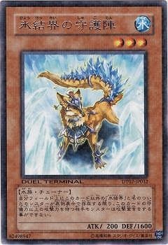 氷結界ひょうけっかいの守護陣しゅごじん/Defender of the Ice Barrier》 † チューナー(効果モンスター) 星3/水属性/水族/攻 200/守1600 自分フィールド上にこのカード以外の 「氷結界」と名のついたモンスターが存在する限り、 このカードの守備力以上の攻撃力を持つ 相手モンスターは攻撃宣言できない。