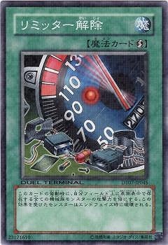 《リミッター解除かいじょ/Limiter REmoval》(準制限カード) † 速攻魔法 (7):自分フィールドの全ての機械族モンスターの攻撃力は、ターン終了時まで倍になる。 この効果が適用されているモンスターはこのターンのエンドフェイズに破壊される。