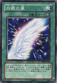 《白銀はくぎんの翼つばさ/SiLVer Wing》 † 装備魔法 レベル8以上のドラゴン族シンクロモンスターにのみ装備可能。 装備モンスターは1ターンに2度まで、戦闘では破壊されない。 装備モンスターがカードの効果によって破壊される場合、 代わりにこのカードを破壊する事ができる。