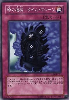 《時ときの機械きかい−タイム・マシーン/Time Machine》 † 通常罠 (1):自分または相手のモンスター1体が 戦闘で破壊され墓地へ送られた時に発動できる。 そのモンスターが破壊された時のコントローラーのフィールドに 同じ表示形式でそのモンスターを特殊召喚する。