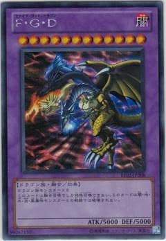 《F・G・Dファイブ・ゴッド・ドラゴン/Five-Headed Dragon》 † ・効果モンスター 星12/闇属性/ドラゴン族/攻5000/守5000 ドラゴン族モンスター×5 このカードは召喚でしか特殊召喚できない。 (1):このカードは闇・地・水・炎・風属性モンスターとの戦闘では破壊されない。