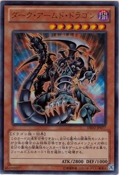 《ダーク・アームド・ドラゴン/Dark Armed Dragon》 † 特殊召喚・効果モンスター 星7/闇属性/ドラゴン族/攻2800/守1000 このカードは通常召喚できない。 自分の墓地の闇属性モンスターが3体の場合のみ特殊召喚できる。 (1):自分の墓地の闇属性モンスター1体を除外し、 フィールドのカード1枚を対象として発動できる。 そのカードを破壊する。