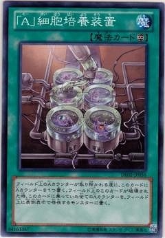 《「Aエー」細胞さいぼう培養ばいよう装置そうち/"A" Cell Incubator》 † 永続魔法 フィールド上のAカウンターが取り除かれる度に、 このカードにAカウンターを1つ置く。 フィールド上のこのカードが破壊された時、このカードに乗っていた全てのAカウンターを、 フィールド上に表側表示で存在するモンスターに置く。