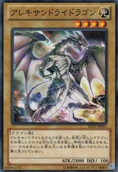 《アレキサンドライドラゴン/Alexandrite Dragon》 † 通常モンスター 星4/光属性/ドラゴン族/攻2000/守 100 アレキサンドライトのウロコを持った、非常に珍しいドラゴン。 その美しいウロコは古の王の名を冠し、神秘の象徴とされる。 ――それを手にした者は大いなる幸運を既につかんでいる事に気づいていない。