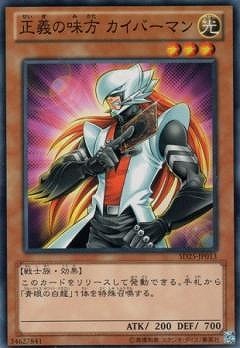 《正義せいぎの味方みかた カイバーマン/Kaibaman》 † 効果モンスター 星3/光属性/戦士族/攻 200/守 700 このカードをリリースして発動できる。 手札から「青眼の白龍」1体を特殊召喚する。