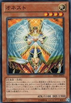 《オネスト/Honest》 † 効果モンスター 星4/光属性/天使族/攻1100/守1900 (1):自分メインフェイズに発動できる。 フィールドの表側表示のこのカードを持ち主の手札に戻す。 (2):自分の光属性モンスターが 戦闘を行うダメージステップ開始時からダメージ計算前までに、 このカードを手札から墓地へ送って発動できる。 そのモンスターの攻撃力はターン終了時まで、 戦闘を行う相手モンスターの攻撃力分アップする。