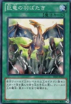 《巨竜きょりゅうの羽はばたき/A Wingbeat of Giant Dragon》 † 通常魔法 (1):自分フィールドのレベル5以上のドラゴン族モンスター1体を選んで持ち主の手札に戻し、 フィールドの魔法・罠カードを全て破壊する。