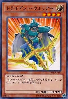 《トライデント・ウォリアー/Trident Warrior》 † 効果モンスター 星4/光属性/戦士族/攻1800/守1200 (1):このカードが召喚に成功した時に発動できる。 手札からレベル3モンスター1体を特殊召喚する。