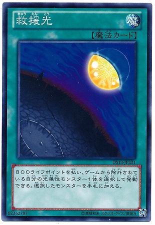 《救援光きゅうえんこう/Light of RedEmption》 † 通常魔法 800ライフポイントを払い、 ゲームから除外されている自分の光属性モンスター1体を選択して発動できる。 選択したモンスターを手札に加える。