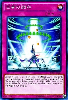 《王者の調和キングス・シンクロ/King's Synchro》 † 通常罠 (1):相手モンスターが自分のSモンスターに攻撃宣言した時に発動できる。 その攻撃を無効にする。 その後、以下の効果を適用できる。 ●その自分のSモンスターと自分の墓地のチューナー1体を除外し、 除外したモンスターのレベルの合計と同じレベルを持つSモンスター1体を、 エクストラデッキからS召喚扱いで特殊召喚する。