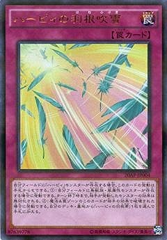 ハーピィの羽根吹雪はねふぶき/Harpie's Feather Storm》 † 通常罠 自分フィールドに「ハーピィ」モンスターが存在する場合、このカードの発動は手札からもできる。 (1):自分フィールドに鳥獣族・風属性モンスターが存在する場合に発動できる。 ターン終了時まで、相手が発動したモンスターの効果は無効化される。 (2):魔法&罠ゾーンのこのカードが相手の効果で破壊された場合に発動できる。 自分のデッキ・墓地から「ハーピィの羽根帚」1枚を選んで手札に加える。