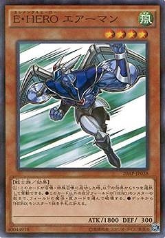 E・HEROエレメンタルヒーロー エアーマン/ElEmental HERO Stratos》 † 効果モンスター 星4/風属性/戦士族/攻1800/守 300 (1):このカードが召喚・特殊召喚に成功した時、 以下の効果から1つを選択して発動できる。 ●このカード以外の自分フィールドの「HERO」モンスターの数まで、 フィールドの魔法・罠カードを選んで破壊する。 ●デッキから「HERO」モンスター1体を手札に加える。