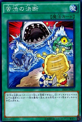 《苦渋くじゅうの決断けつだん/Painful Decision》 † 通常魔法 「苦渋の決断」は1ターンに1枚しか発動できない。 (1):デッキからレベル4以下の通常モンスター1体を墓地へ送り、 その同名カード1枚をデッキから手札に加える。