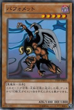 《バフォメット/Berfomet》 † 効果モンスター 星5/闇属性/悪魔族/攻1400/守1800 (1):このカードが召喚・反転召喚に成功した時に発動できる。 デッキから「幻獣王ガゼル」1体を手札に加える。